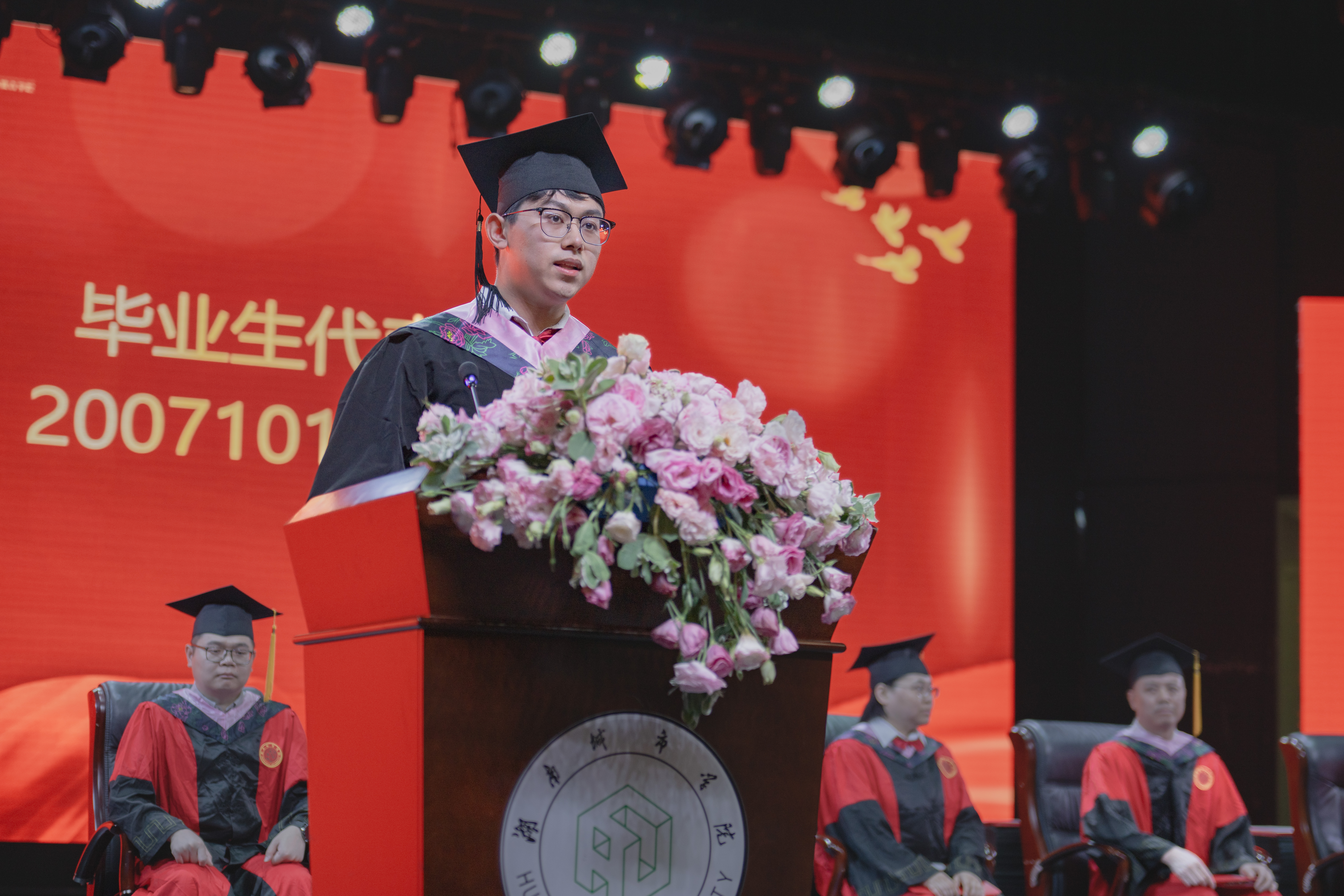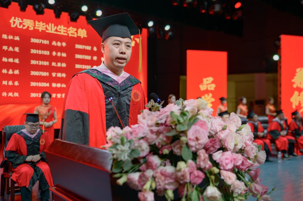 毕业生代表苏天伟发言,分享自己的求学故事与收获感悟,他还特别提到了对母校的感激之情。他表示,正是母校提供的优质教育资源和良好的学习环境,才让他能够在这里茁壮成长。同时,他也对辛勤付出的老师们表达了深深的敬意和感谢。他呼吁所有毕业生要牢记习近平总书记的嘱托挺膺担当,争做中国式现代化的时代新人,以青春之名,赴时代之约。