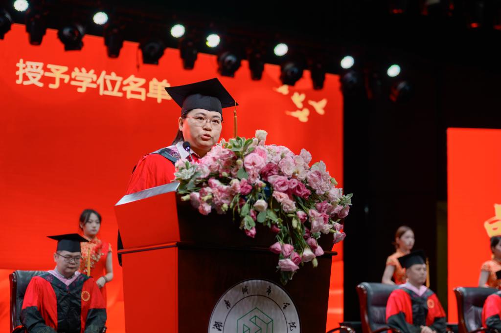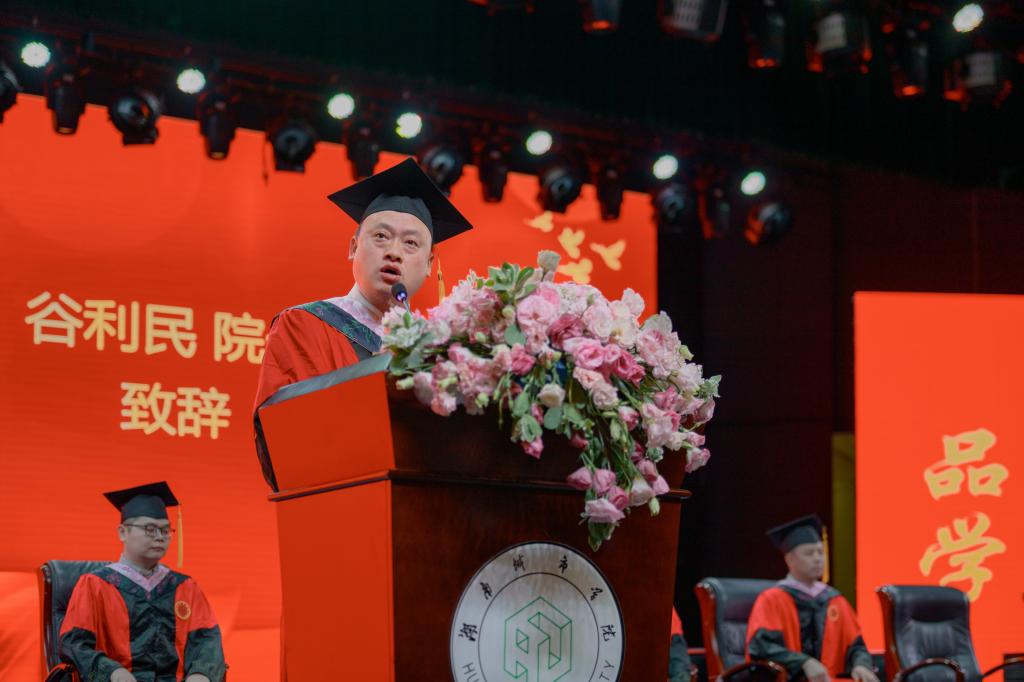 毕业典礼在雄壮的国歌声中拉开序幕,由谷利民院长致辞,首先向圆满完成学业的毕业生们表示衷心祝贺,并鼓励他们带着四年的知识和经验,勇敢地踏上人生的新征程。他鼓励毕业生们勇敢追求梦想,在各自的领域里发挥所长、创造价值。同时,他也强调母校永远是毕业生们的家,希望他们能够常回母校看看,与母校共同分享成功的喜悦和分担生活的风雨。