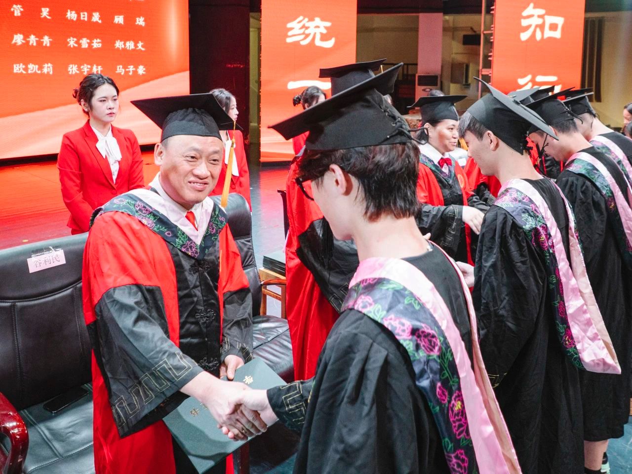 在热烈的掌声中,优秀毕业生与校友联络员名单宣读环节将现场气氛推向高潮。学院党委书记钟正武以铿锵有力的语调,依次宣读优秀毕业生、校友联络员名单。每一个名字,每一次掌声都承载着校园里无数个奋斗的日夜,也勾勒出未来联结的温暖脉络。宣读完毕后,钟正武书记亲手为受表彰的优秀毕业生、新任校友联络员颁发荣誉证书与聘书,并与他们亲切握手、合影留念,以庄重的仪式感传递学校对学子们的殷切期许与深切关怀。这份证书不仅是荣誉的象征,更是激励学子们在未来人生道路上继续拼搏奋进、维系校友纽带的有力见证。