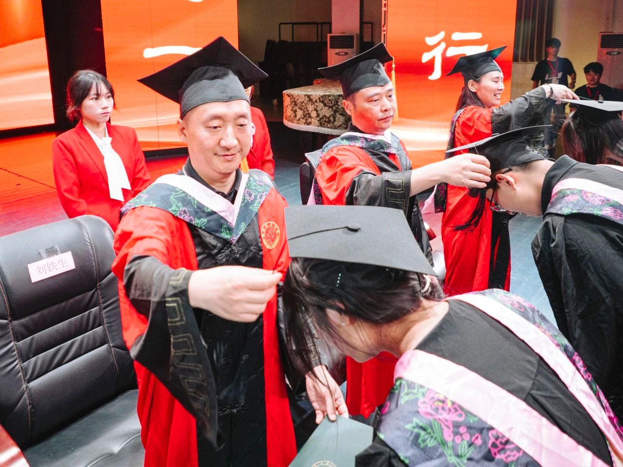 活动尾声,龚力副院长宣读学位授予决定和毕业作品获奖名单后,钟正武、谷利民等十位导师为毕业生逐一拨穗。
