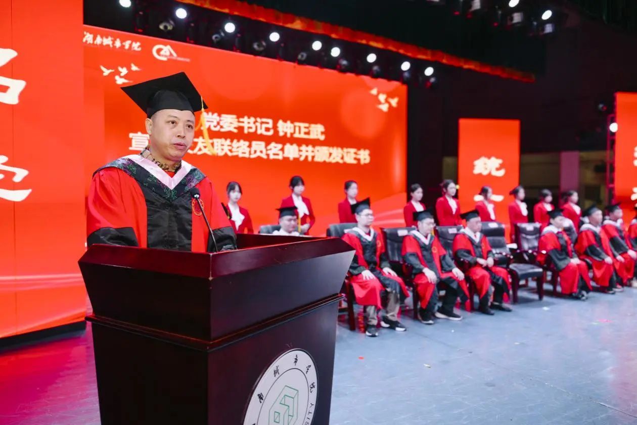院党委副书记郑学达主持此次毕业典礼。当导师们步伐稳健步入会场,毕业生们以热烈掌声致敬师恩。国歌奏响,全体肃立,激昂旋律点燃家国情怀,更坚定“以艺报国”使命。会龙山的晨光、资水畔的暮色,都化作学子服务社会的责任担当。