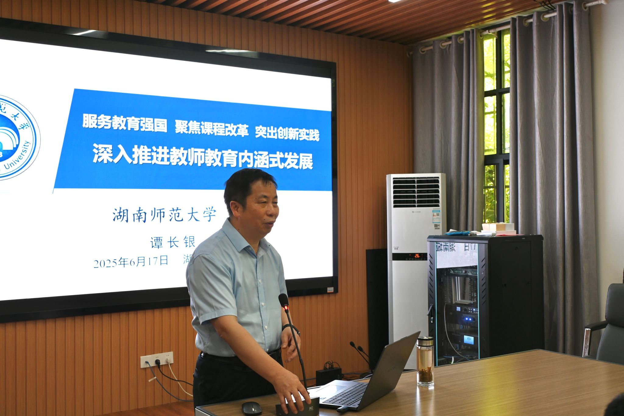 2025年6月17日下午,本科教育教学评估专家、教育部师范专业认证专家、湖南师范大学教学督导委员会副主任谭长银教授(博士生导师)受邀来我院进行主题为《深入推进教师教育内涵式发展》的师范认证专题讲座,会议由谷利民院长主持,院党政领导班子及美术学系全体教师参加会议。