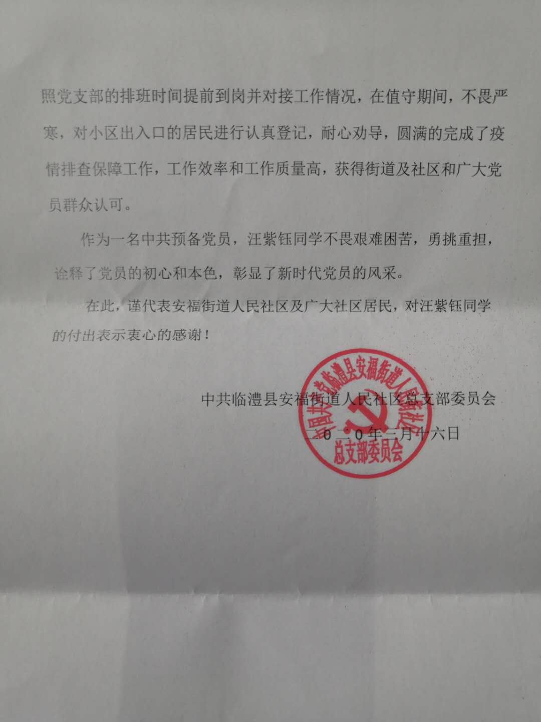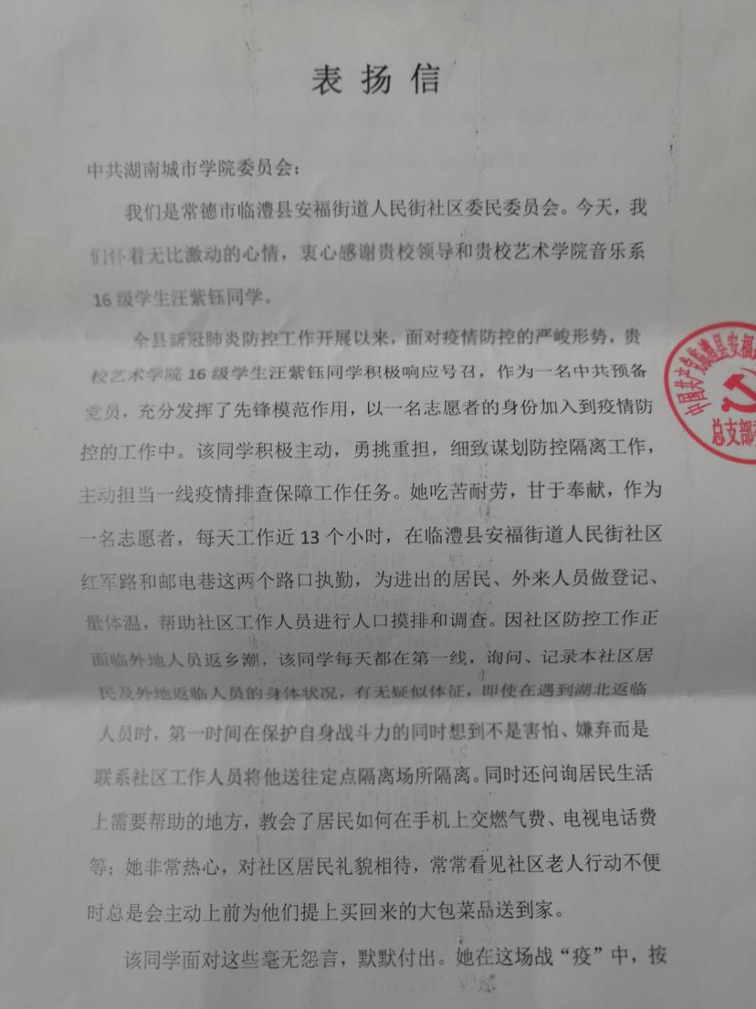 5月8日是76net必赢官网毕业班开学的日子,在学生公寓党员党支部值班点,艺术学院党委副书记张清华老师收到一封特别表扬信,高度评价我院毕业生汪紫钰疫情期间深入一线抗疫的先进事迹。