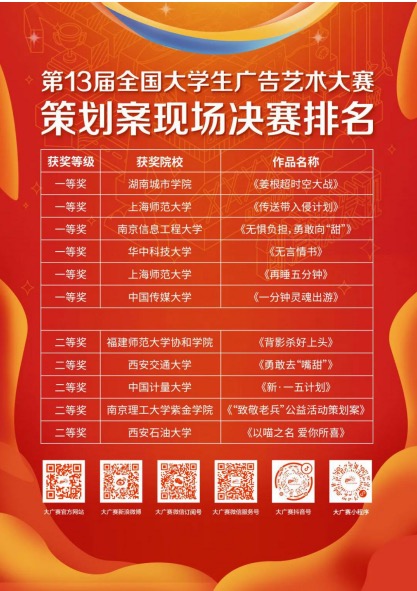 据悉,全国大学生广告艺术大赛创建于 2005 年,是教育部举办得最早的高校 A 类(一类)文科赛事,也是中国高等教育学会“高校竞赛评估与管理体系”、“高校竞赛评估排行榜”中的观测赛事。本届大赛组委会共收到来自全国 29 个赛区 1679 所高校 481947 组参赛作品,参赛学生高达 1292604 人次,经过学校初评、赛区评选、全国组委会的再次筛查,最终共 36932 组作品进入全国总评审。策划案共计收到作品 11315 件,其中排名前 11 名的作品进入“中国大学生好创意”策划案现场决赛,通过参赛团队提案现场展示、专家评委点评提问等方式评审出一等奖。