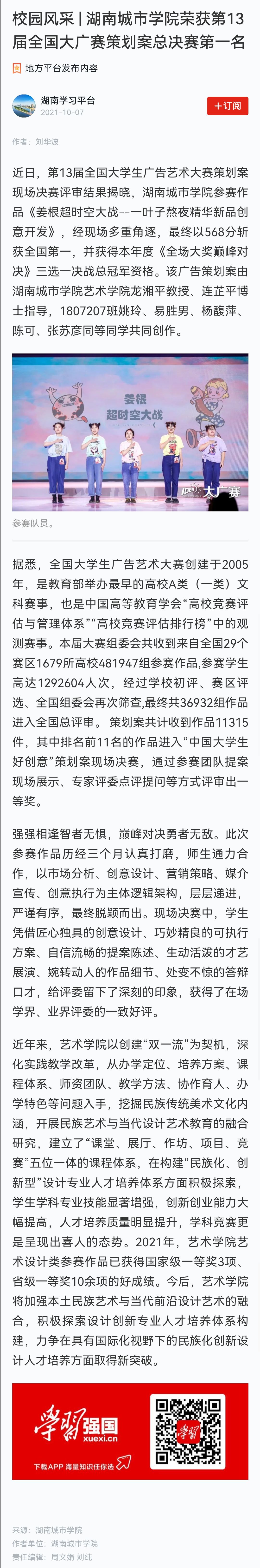 本网讯(通讯员 刘华波)2021年9月29日,第13届全国大学生广告艺术大赛策划案现场决赛评审结果揭晓,由我校艺术学院龙湘平教授、连芷平博士指导的1807207班姚玲、易胜男、杨馥萍、陈可、张苏彦同等同学创作的广告策划案《姜根超时空大战--一叶子熬夜精华新品创意开发》,经现场多重角逐,最终以568分斩获全国第一,荣获一等奖,并获得本年度《全场大奖巅峰对决》三选一决战总冠军资格。