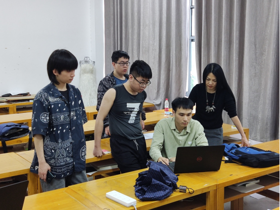 连芷平博士(左一)指导孙煊博(左二)和郭方楷(右一)脚本设计。