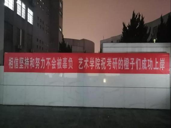 考前,学院在美艺楼、美术楼及音乐楼前都悬挂了横幅,为考生们加油鼓劲。在考研动员和服务上,艺术学院不论是从考研制度保障、氛围营造、考前动员、经验交流、教师辅导、信息咨询,还是送考、接考、考研慰问等多方面都给予最大的关心和支持,让每个考生都在最好的环境中安心备考。