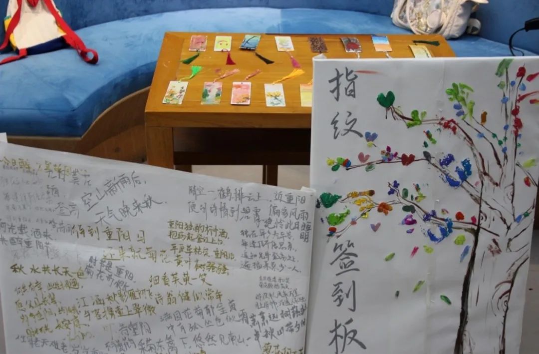 “以墨抒情”环节,同学们在主题展板上写下关于金秋和重阳的诗句,同时创作出相应的主题书签,并在“指纹签到板”上,留下专属“树叶”。
