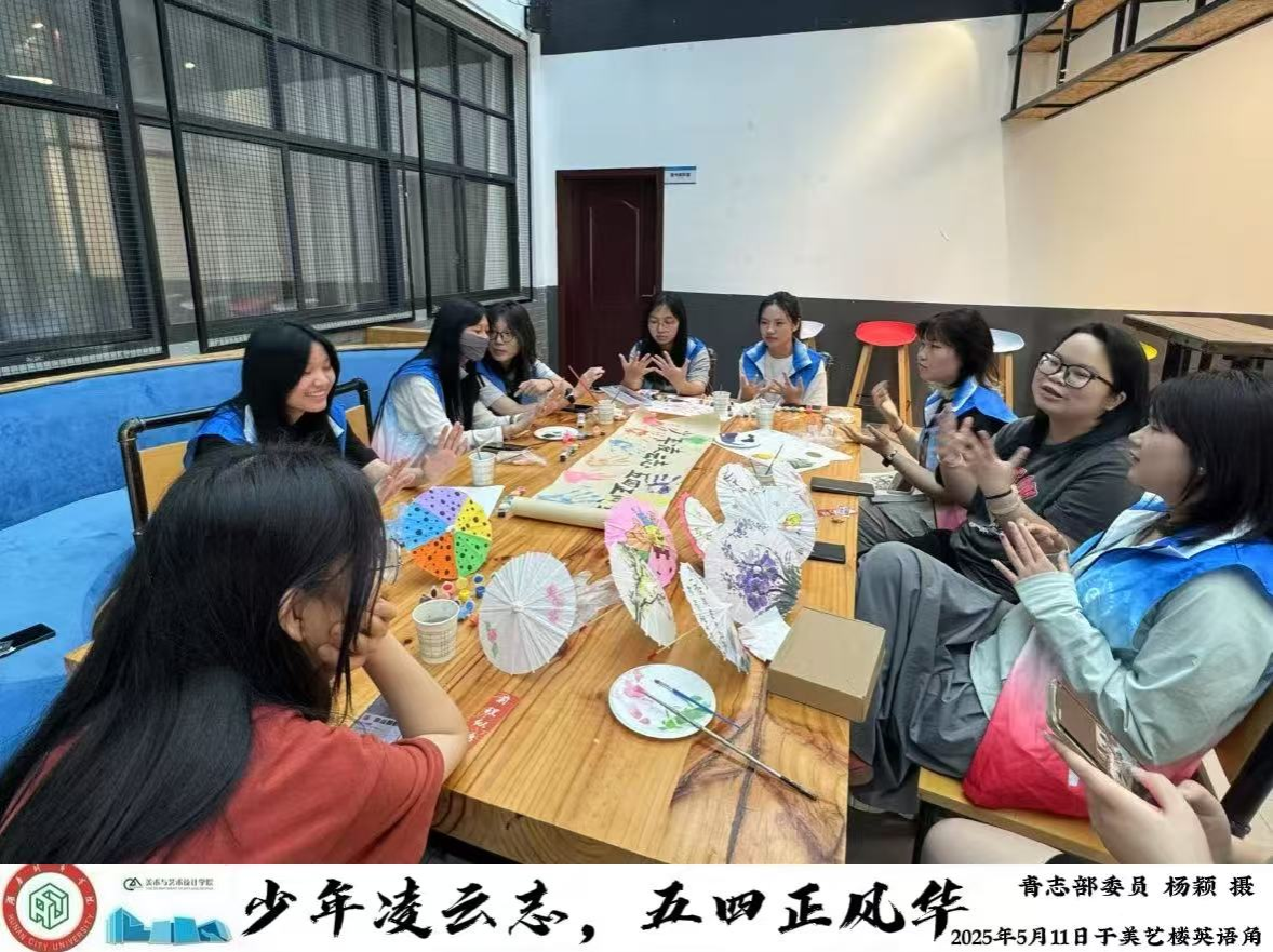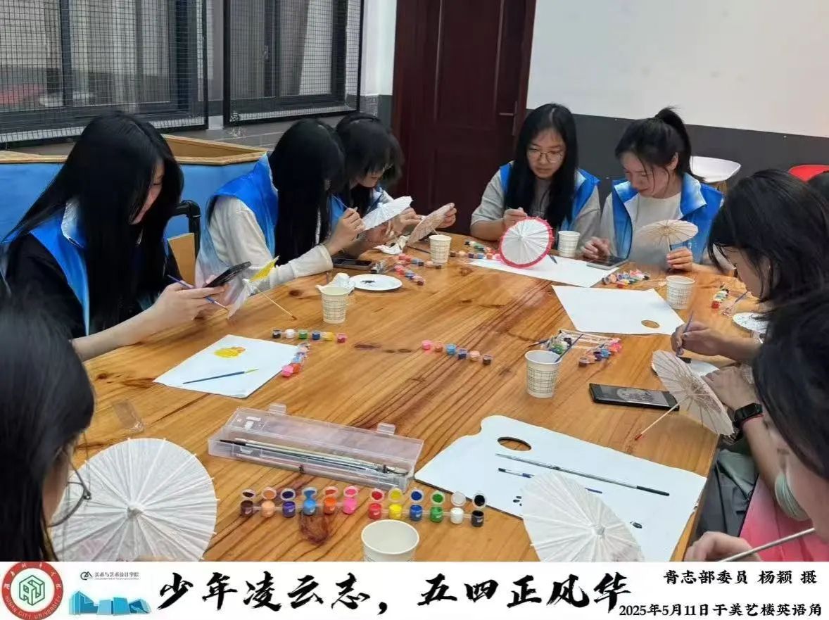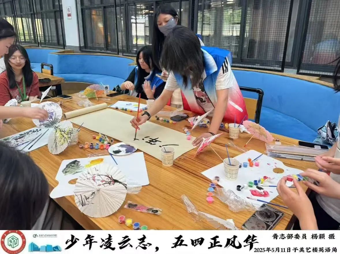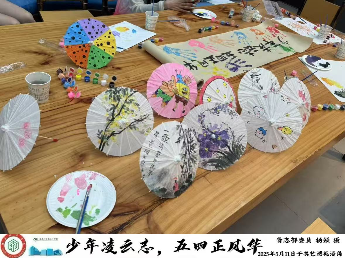 活动现场,丰富多彩的环节吸引着同学们踊跃参与。在油纸伞创作环节,志愿者们领取油纸伞与颜料,围绕五四精神、青春风采、廉洁文化等主题尽情挥洒创意。他们将传统油纸伞与现代元素巧妙融合,把抽象的五四精神与廉洁文化具象化为一幅幅生动的图案。创作完成后,大家集中展示作品并分享创作思路,在艺术表达中深化了对五四精神的理解与传承。