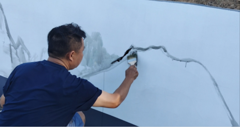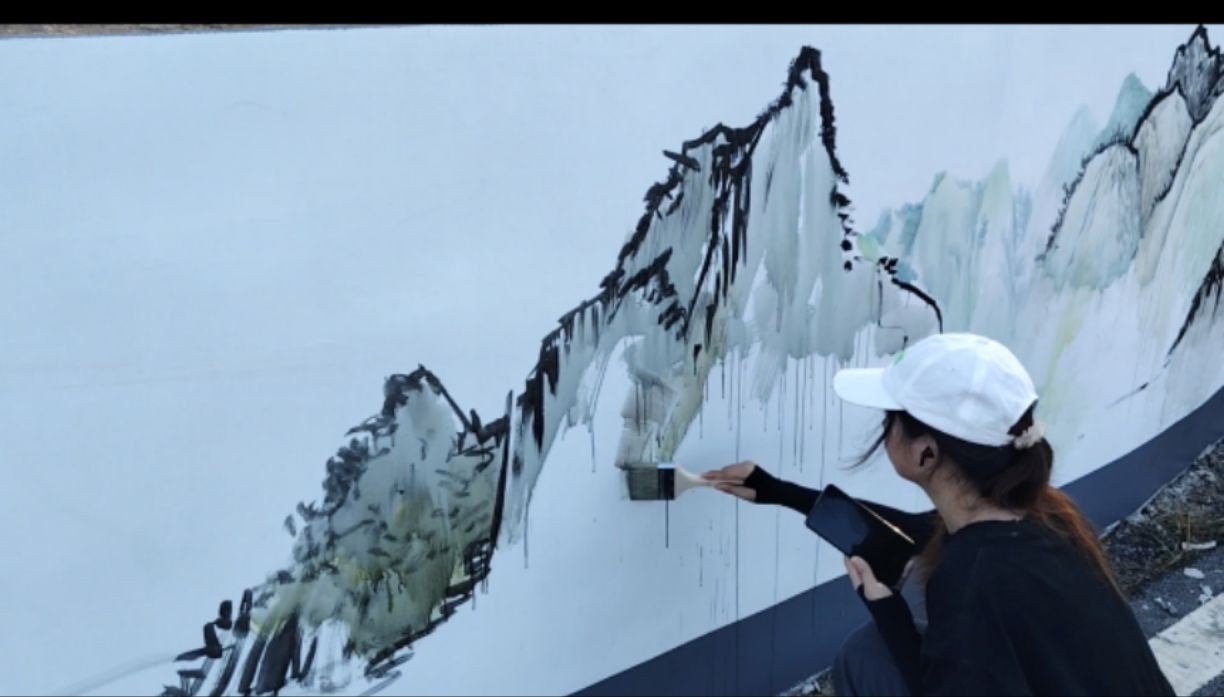 创作中,队员们从勾勒山骨水脉,到调墨以淡赭晕染晨曦,再到用浓墨点染、花青铺展溪涧,队员们灵活运用皴擦、点染等国画技法,让静态的山水渐渐有了呼吸。一幅兼具古韵与乡情的画卷便在墙面上徐徐“生长”。