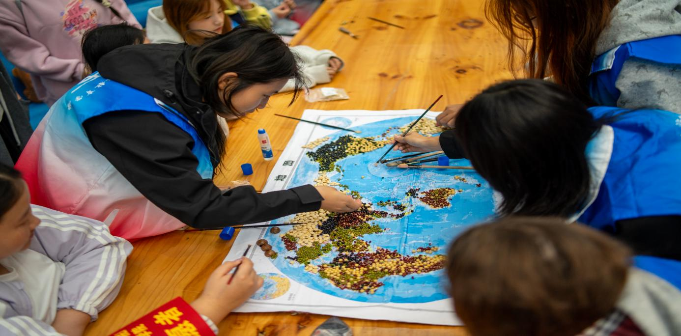 “粮食拼地图”环节。志愿者提前准备好小麦、玉米、红豆等颗粒饱满的粮食作物,参与者们分工协作将粮食颗粒拼贴成世界地图的轮廓。在小心翼翼地摆放与调整中,用粮食颗粒拼出的世界版图,让‘守护全球粮食安全’的共同愿景,在指尖的排布里变得清晰可触。