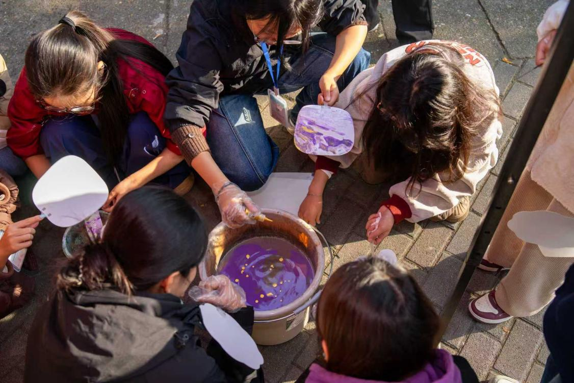 漆扇制作区:参与者们发挥创意,调色、勾勒、晕染,将天然漆料与木质扇骨融合,打造独一无二的漆扇。志愿者指导大家调合漆料、掌握晕染节奏,同学们戴上手套,拿起工具开始创作——有的用渐变紫调搭配金箔点缀,有的以清新蓝绿晕染出山水意境,还有的将校园风景简化为线条绘在扇面。调色时的认真、晕染时的专注、成品出炉时的惊喜,让传统漆艺的雅致在校园里焕发生机。