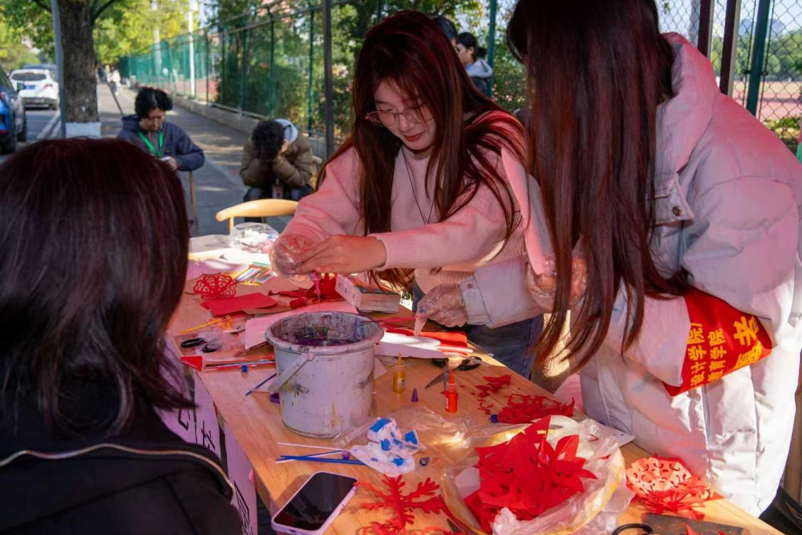 梅山剪纸区:志愿者现场示范折、剪、刻的手法,同学们跟着步骤创作,红纸流转间,传统纹样与青春创意结合,大家围成圈,先跟着示范学习对称折法——有的选二折剪出简洁纹样,有的尝试四折创作繁复图案,指尖小心翼翼调整纸张角度,生怕折痕偏差影响最终效果。