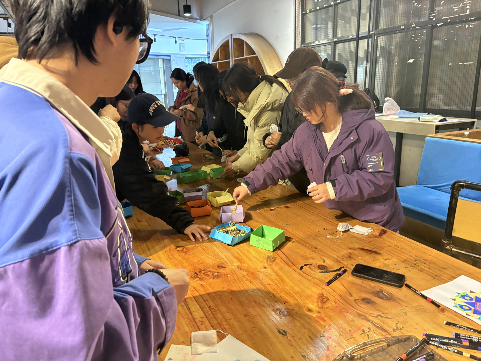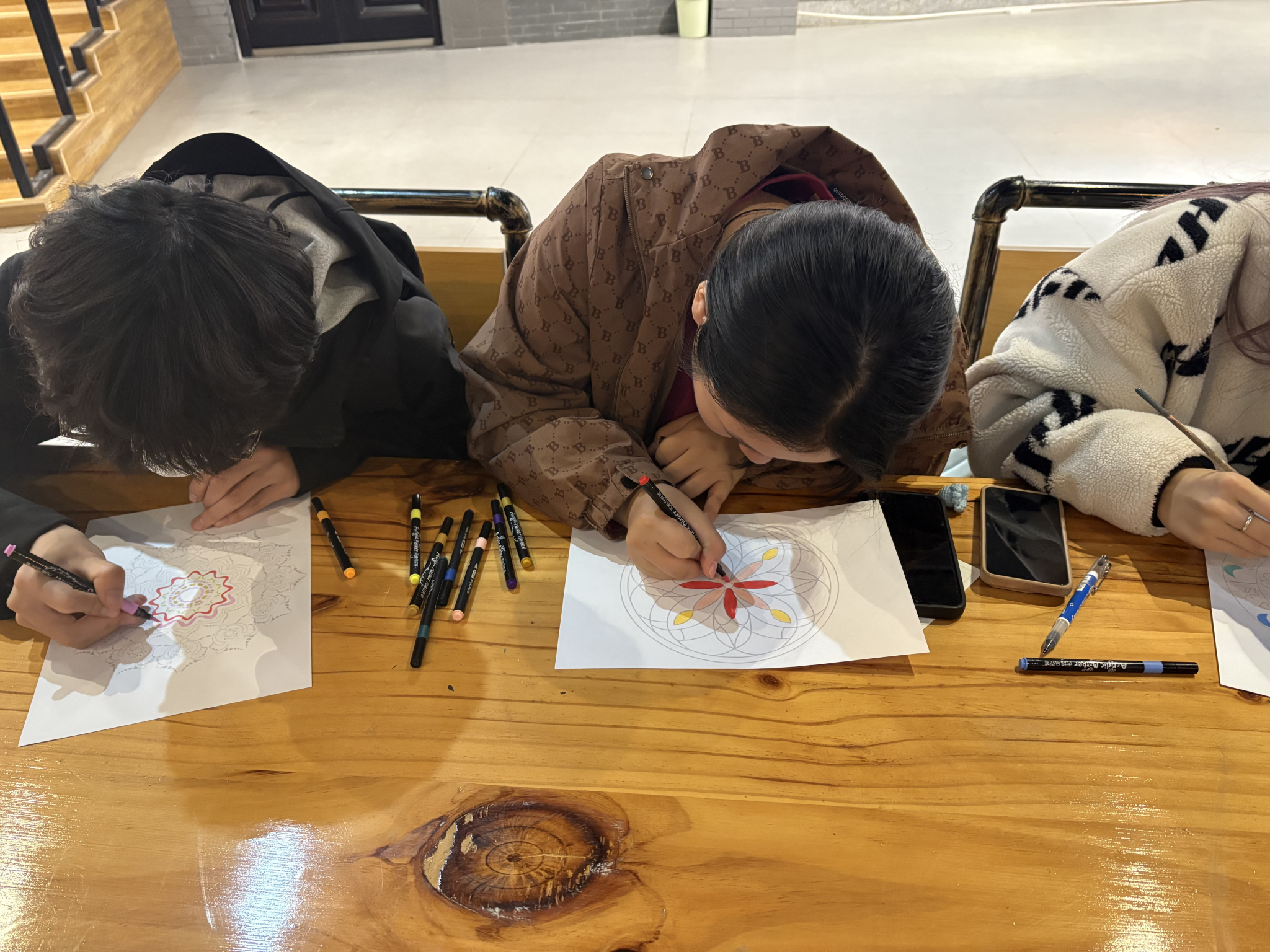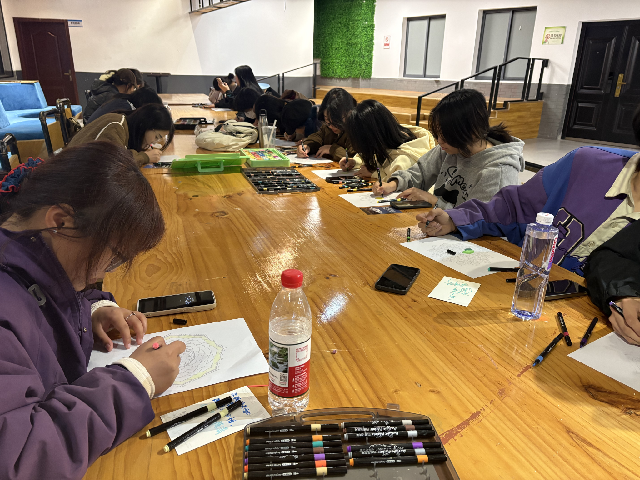 2025年11月29日晚,我院于美艺楼3楼英语角推出了“彩绘心晴”系列活动之“沿途绘心,墨染青云”心理特色活动。本场活动以艺术为纽带,借色彩线条疏解学业压力,又以专业创作的共鸣凝聚成长的力量。