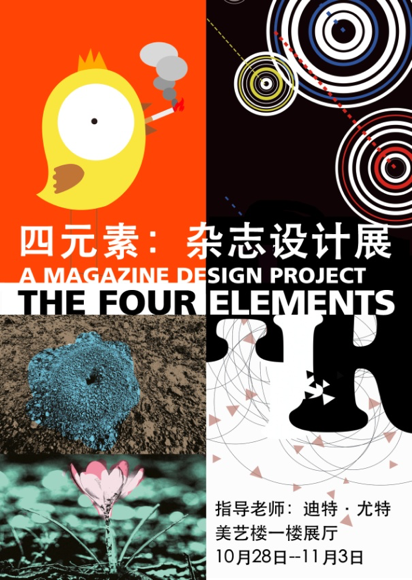 本次展出画一共200余幅。所有作品通过迪特.尤特老师的指导下,将课堂理论和实际实践很好的交融衔接,作品通过杂志的方式进行展览,一步一步融合,并反复修改所展示出来的精品。四个班级的主题分别是:水、火、空气、地球四大元素,所有同学都是将创意、色彩搭配的杂志展示充满着想象力。