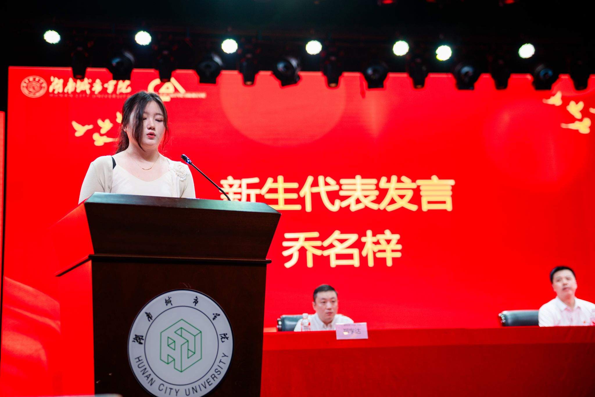2024级新生代表乔名梓同学,她满怀激情地表达了对即将展开的大学生活无限美好的向往与憧憬。她倡议大家要勇于探索未知,不畏艰难,积极参与各类学术活动、社会实践和志愿服务,让青春的汗水在奋斗中闪光,争做新时代挺膺担当的青春奋斗者。
