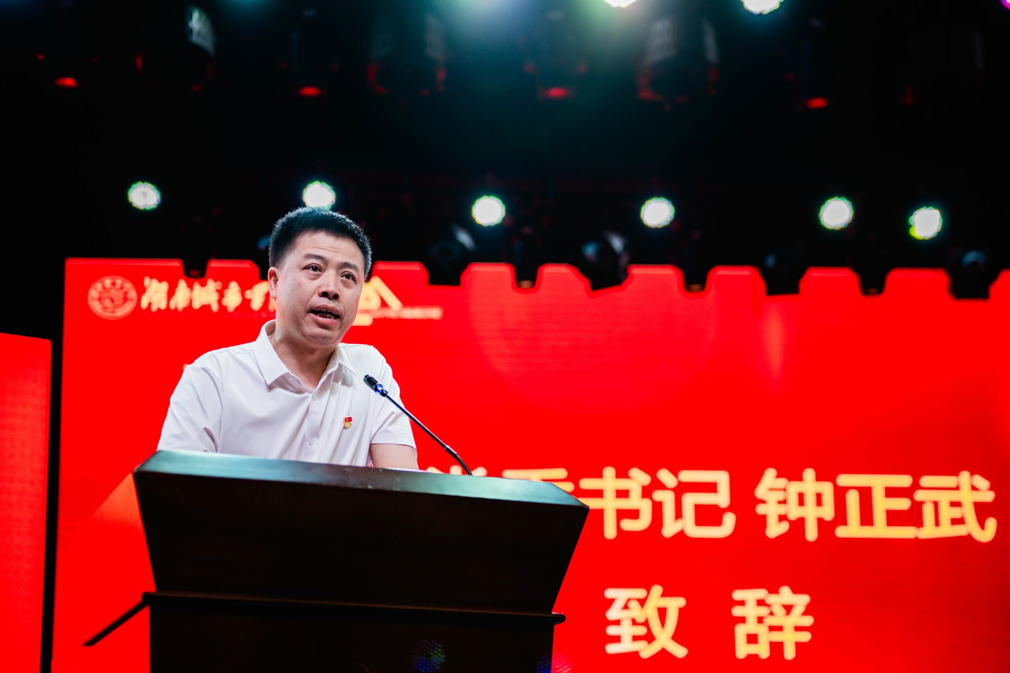 典礼在庄严的国歌声下拉开帷幕。学院党委书记钟正武代表全院师生对2024级新同学的到来表示热烈欢迎!首先,钟正武书记向同学们介绍了学校以及学院的历史进程、办学特色和教学资源。他表示:“为学先为人,要培养宽容、坚韧、优秀的品德”。他深深寄语同学们要学会自主学习,完成学业的同时提升自身的综合素养,以开放的心态拥抱多元文化,以包容的胸怀理解不同观点,以创新的思维解决复杂问题,努力成为具有国际视野、社会责任感和创新能力的新时代青年。