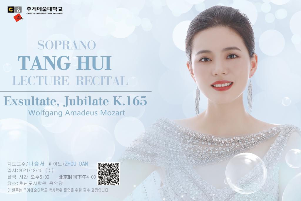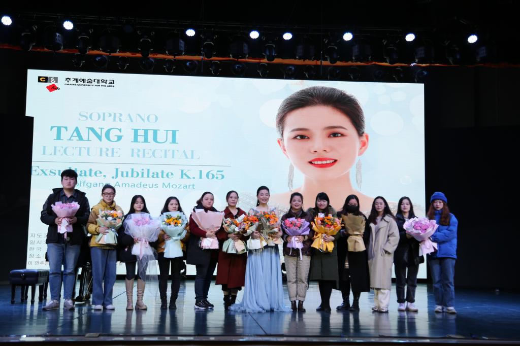 本场音乐会以莫扎特的经文声乐套曲《喜悦欢腾》为主题,以发表讲座与演唱相结合的形式进行。音乐会上半场采用韩文发表的形式对作品进行解读,同时为了方便国内观众更好的理解发表内容,以中文PPT同步呈现;下半场由汤慧博士对发表作品进行演唱。汤慧博士从作曲家生平、经文歌定义、歌曲创作背景与结构、作品分析与演唱多方面进行了深入的分析与讲解,让观众对18世纪的经文歌声乐体裁有了深入的认识与了解。