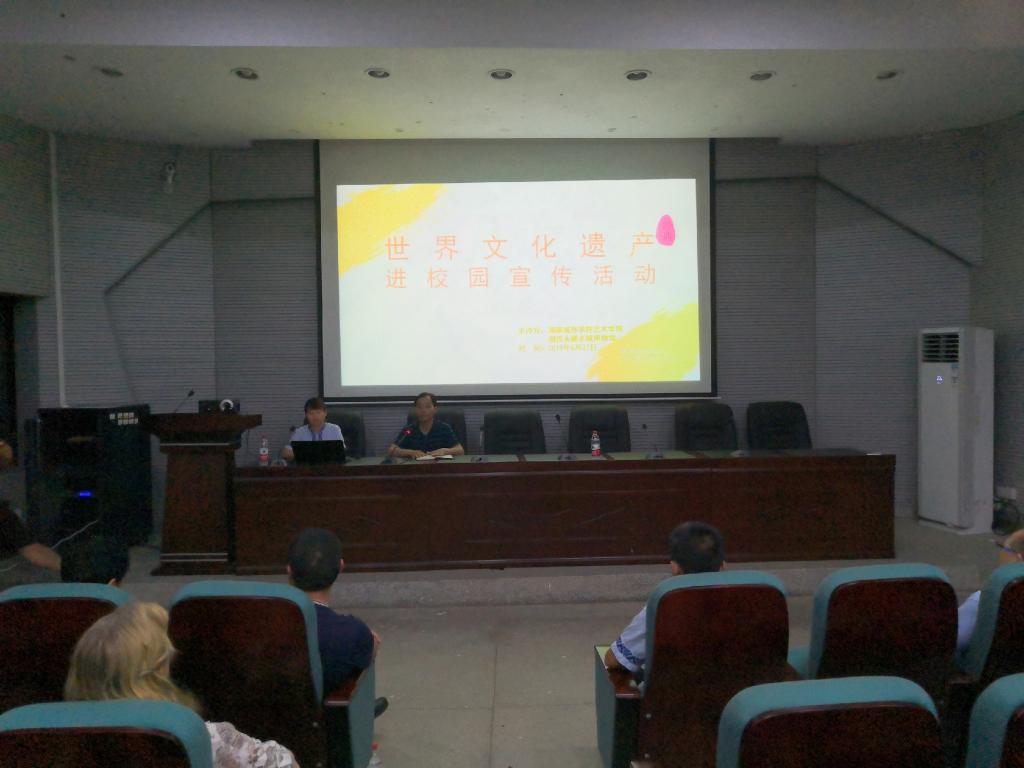 为弘扬中华民族优秀传统文化,加深同学们对非物质文化遗产的认识与了解。6月27日下午1600艺术学院/国际教育学院在美艺楼107报告厅举办世界文化遗产进校园专题讲座,讲座由湘西武陵山土司文化研究院研究生丁海燕主讲。湘西永顺老司城管理处党工委委员张立、规划科杨秀齐、法规科瞿章辉、保护科向晓光国际教育学院院长龙湘平以及部分师生100余人聆听了讲座。讲座由学院党委副书记张清华主持。
