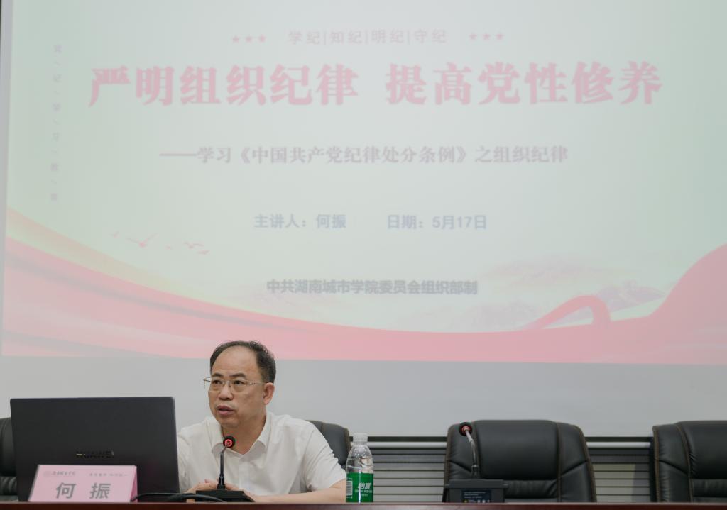 为深入学习贯彻《中国共产党纪律处分条例》,落实党中央、湖南省委关于党纪学习教育的工作部署和要求,5月17日上午学校党委副书记、校长何振同志在美艺楼107会议室为我院师生党员上了一堂“严明组织纪律 提高党性修养”的专题党课。